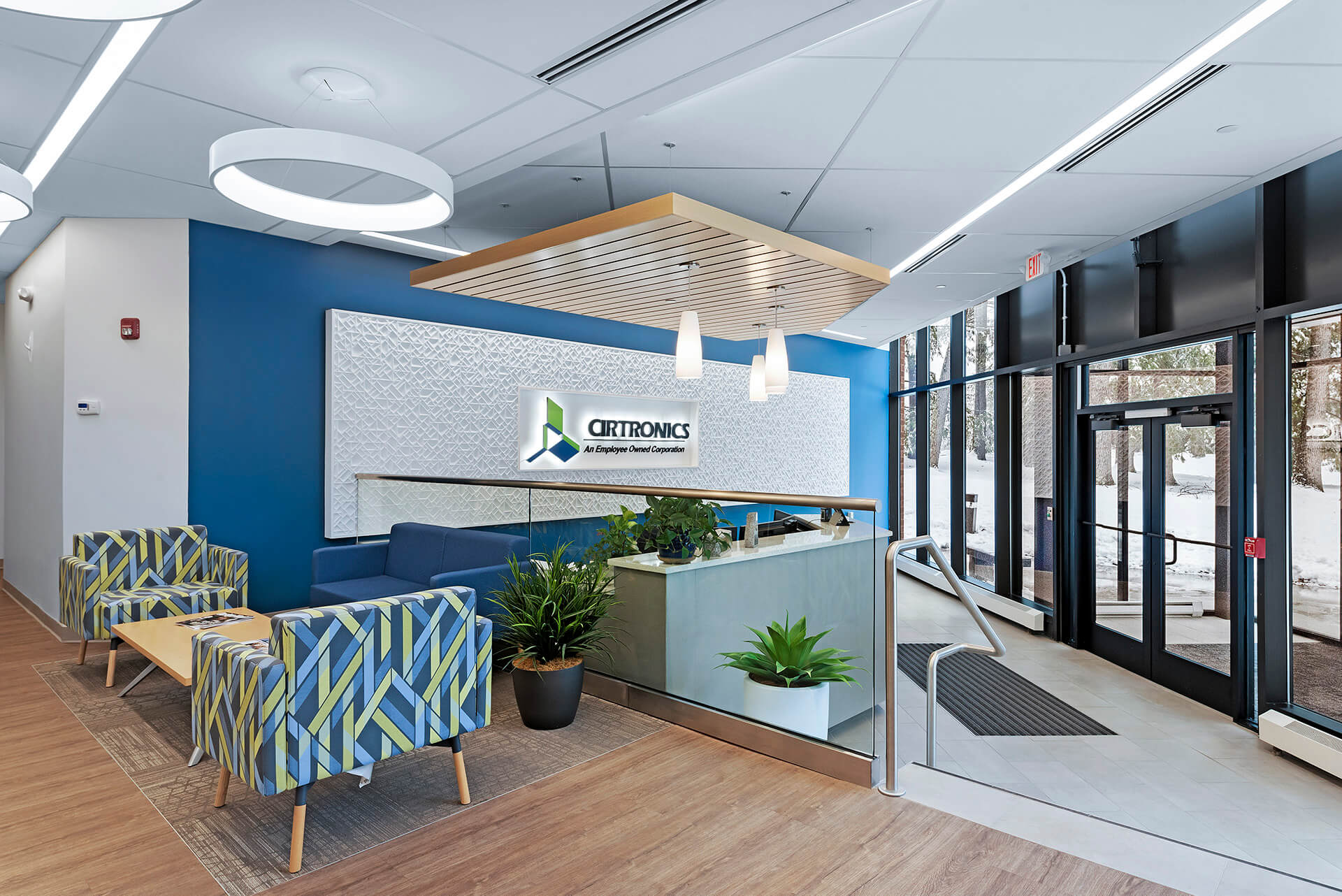 Ebbrell Architecture + Design transformed a dated, underused lobby into a multi-zone reception space for Cirtronics, creating a modern glass entry and new areas for vendor presentations, a customer coffee lounge, and a welcoming reception desk.